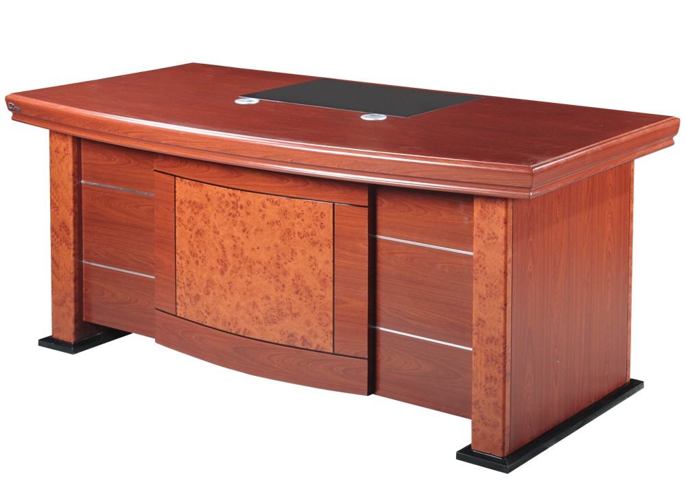 Bàn lãnh đạo mặt lượn cong, trên mặt có tấm PVC trang trí và chống trượt, đồng thời khoét lỗ đi dây điện, tiện lợi cho người sử dụng. Yếm bản ghép hộp lượn cong soi chỉ và ốp nổi tạo điểm nhấn cho sản phẩm.