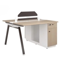 Cụm bàn làm việc 2 chỗ ngồi, mặt bàn bằng gỗ công nghiệp phủ Melamine dày 25mm. Chân bàn sử dụng thép ống 10x50 sơn tĩnh điện sắc nét. Giằng bàn bằng sắt kết hợp máng đi dây điện, 2 bên chân bàn có hộp điện đi dây và tăng cứng khung chân. Trên mặt bàn có vách ngăn bằng gỗ bọc vải nỉ giúp tạo không gian riêng tư cho người sử dụng