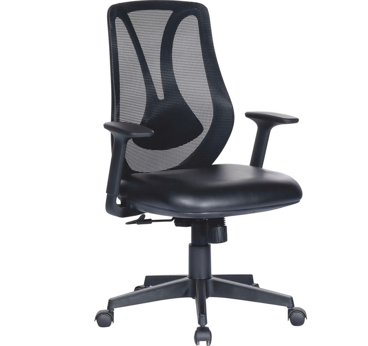 Ghế lưới lưng trung không có tựa đầu, đệm mút xốp bọc PVC. Khung tựa bằng nhựa bọc vải lưới, phần tay chữ T bằng nhựa.