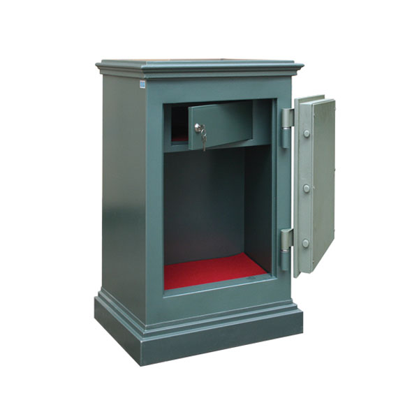 Két sắt đứng dùng mặt nạ nhựa, có 1 khoá chìa, 1 khoá mã, 1 tay nắm. Cánh mở với 3 chốt chìm. Bên trong có 1 ngăn kéo có khóa.
