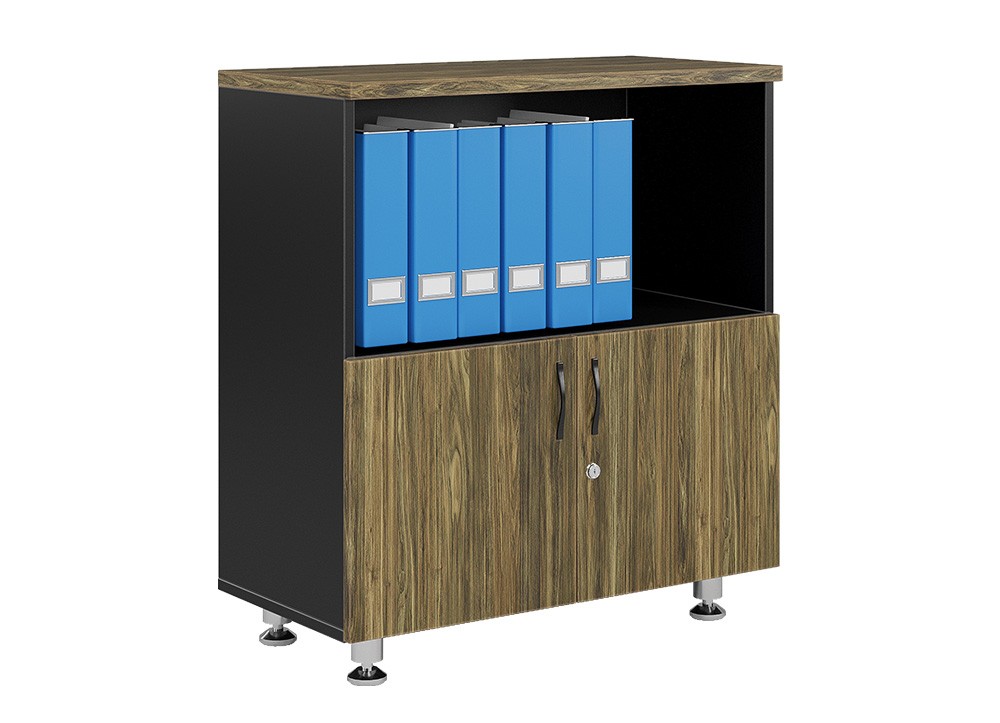 Tủ hồ sơ thấp chia thành 2 tầng file hồ sơ. Tầng trên không có cánh tủ, tầng dưới có 2 cánh mở, có khóa. Tủ được làm bằng chất liệu Melamine.